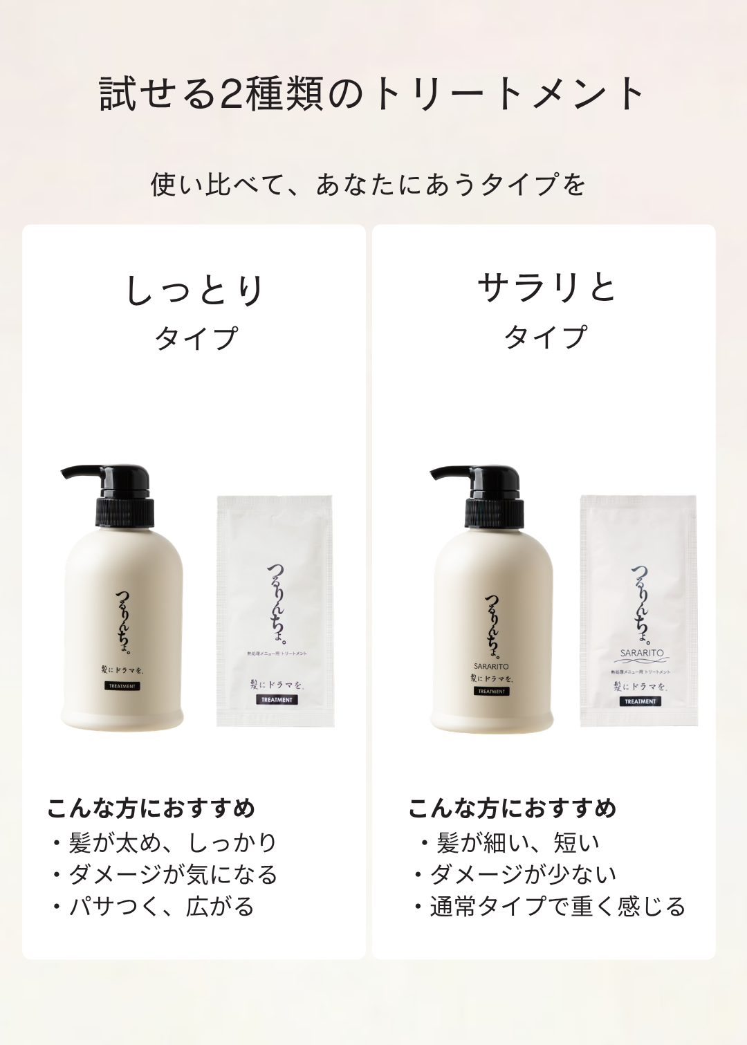 美容院でオススメされてから使用しています。今までドラッグストアで買える物からテレビショッピング、ネットで紹介されている有名人プロデュースの高級シャンプー、トリートメント…たっくさん買って試してきました。ぜんぜん合わなかったり、まぁまぁな物もありましたが100%満足ではなくて…。そしてようやくこちらに落ち着きました。旅行先にも必ず持参しています。 髪の毛は細くて柔らかいタイプです。縮毛矯正と毛先にパーマをあてています。頻繁に白髪染めもしていますが、こちらの商品のおかげでロングヘアを保てています。 これからも使い続けます。